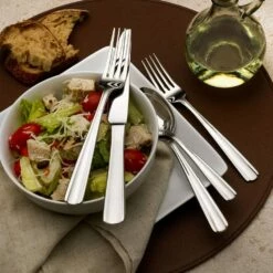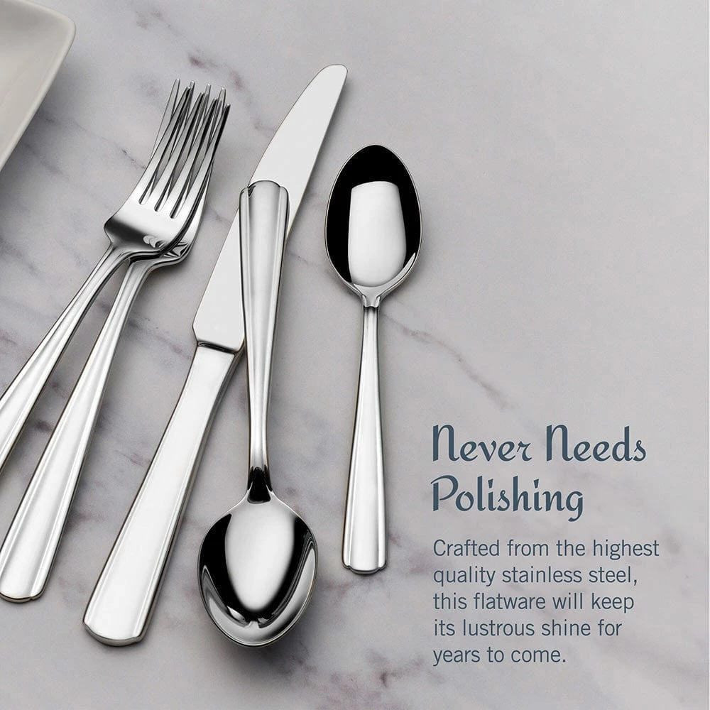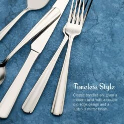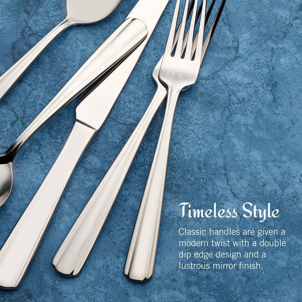 This Bella Flatware Set features classic curved handles that are given a modern twist with a double-dip edge design and a lustrous mirror finish. The timeless style adds a touch of sophistication to your dining table.