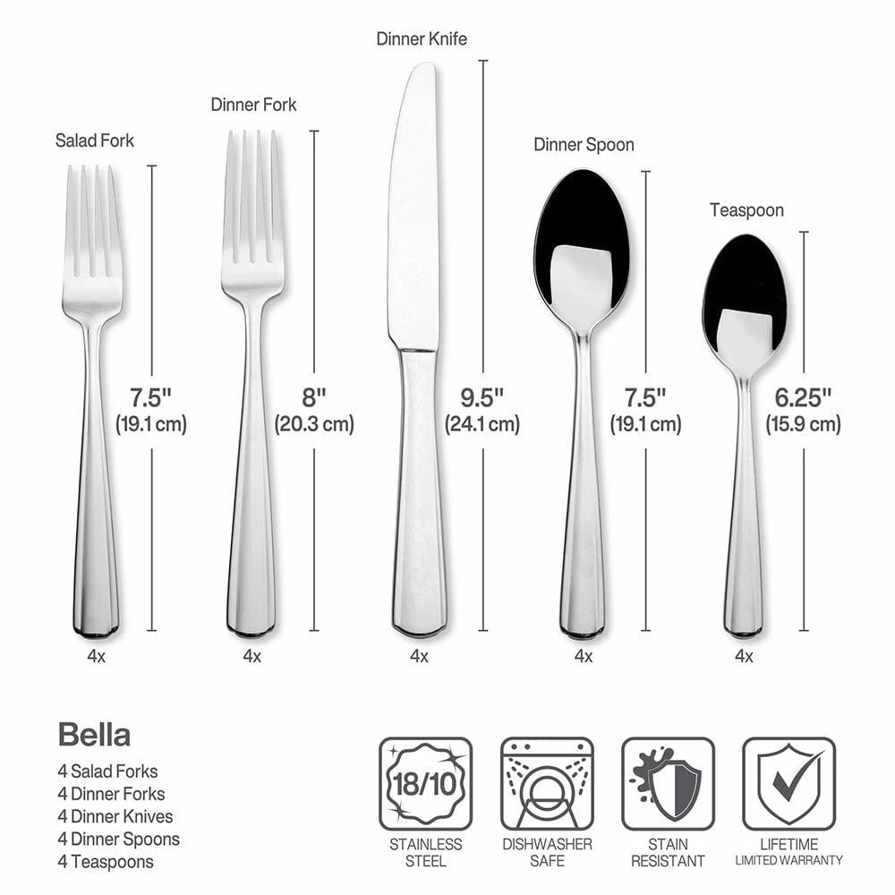 • Flatware Set for 4: This 20 piece flatware set includes (4) each of: dinner fork, salad fork, dinner knife, dinner spoon and teaspoon