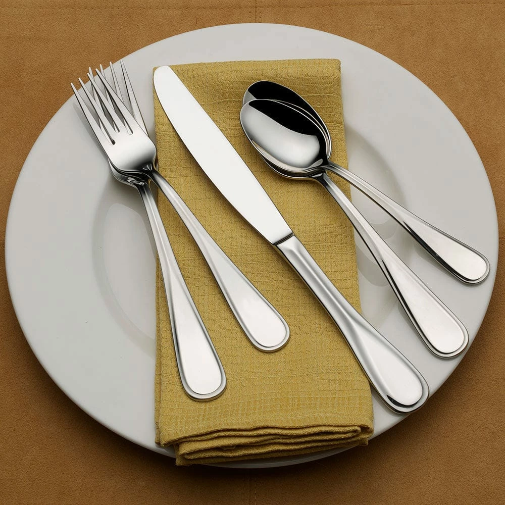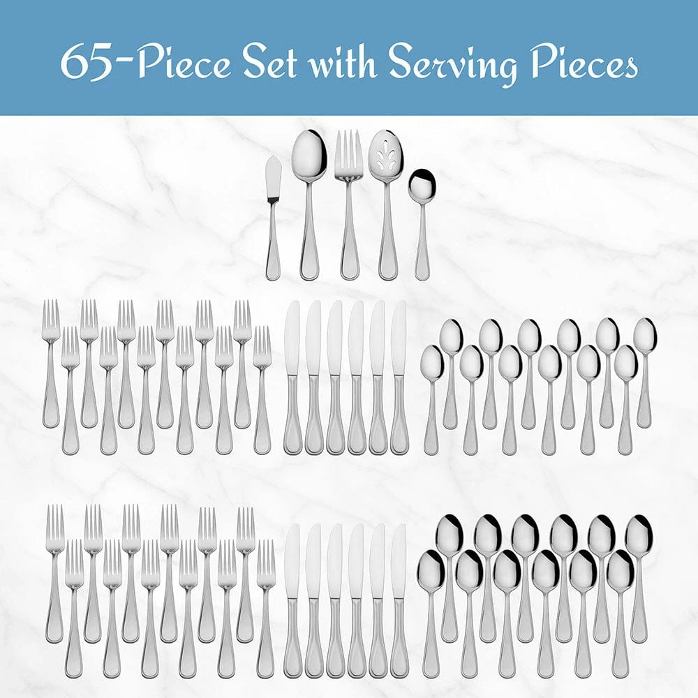 Mikasa Bravo 18/10 stainless steel, 65 Piece Flatware Set includes (12) each: dinner fork, salad fork, dinner knife, dinner spoon & teaspoon, PLUS (1) each: tablespoon, pierced tablespoon, cold meat fork, sugar spoon & butter serving knife.