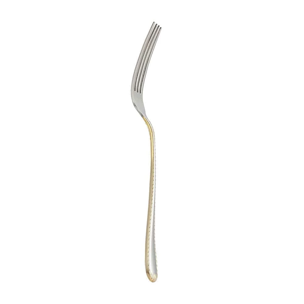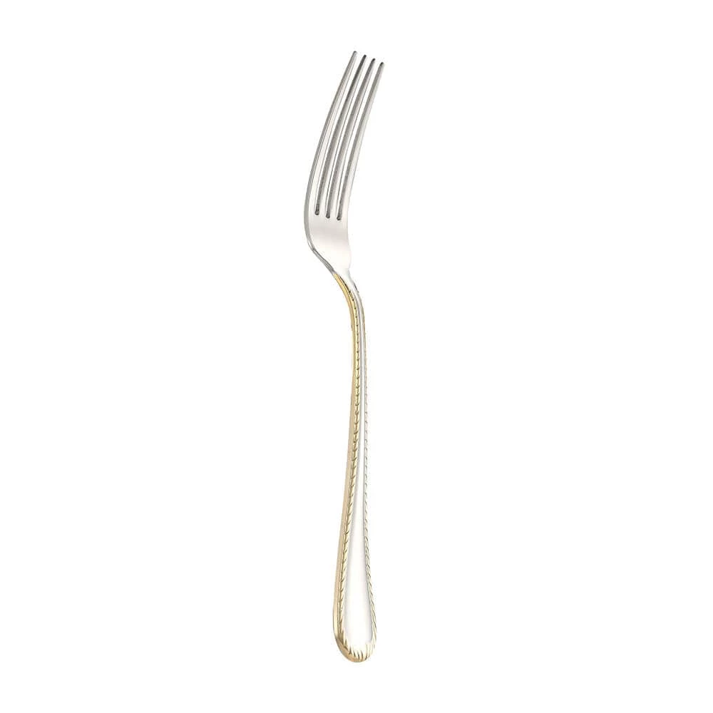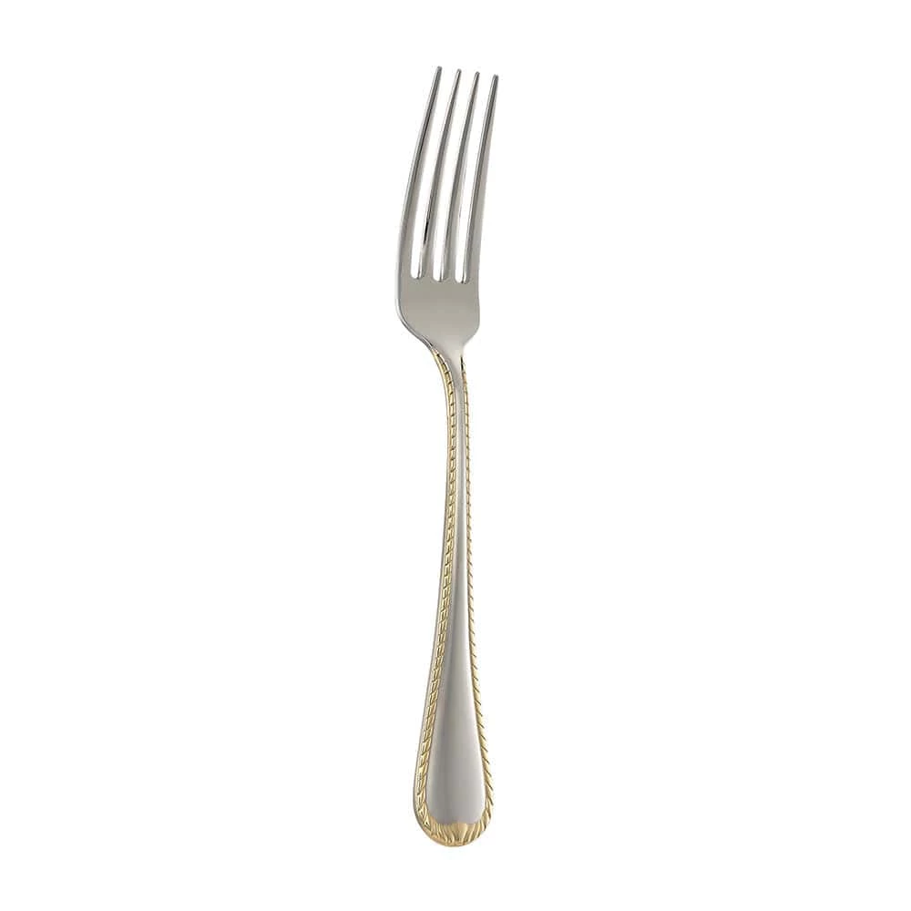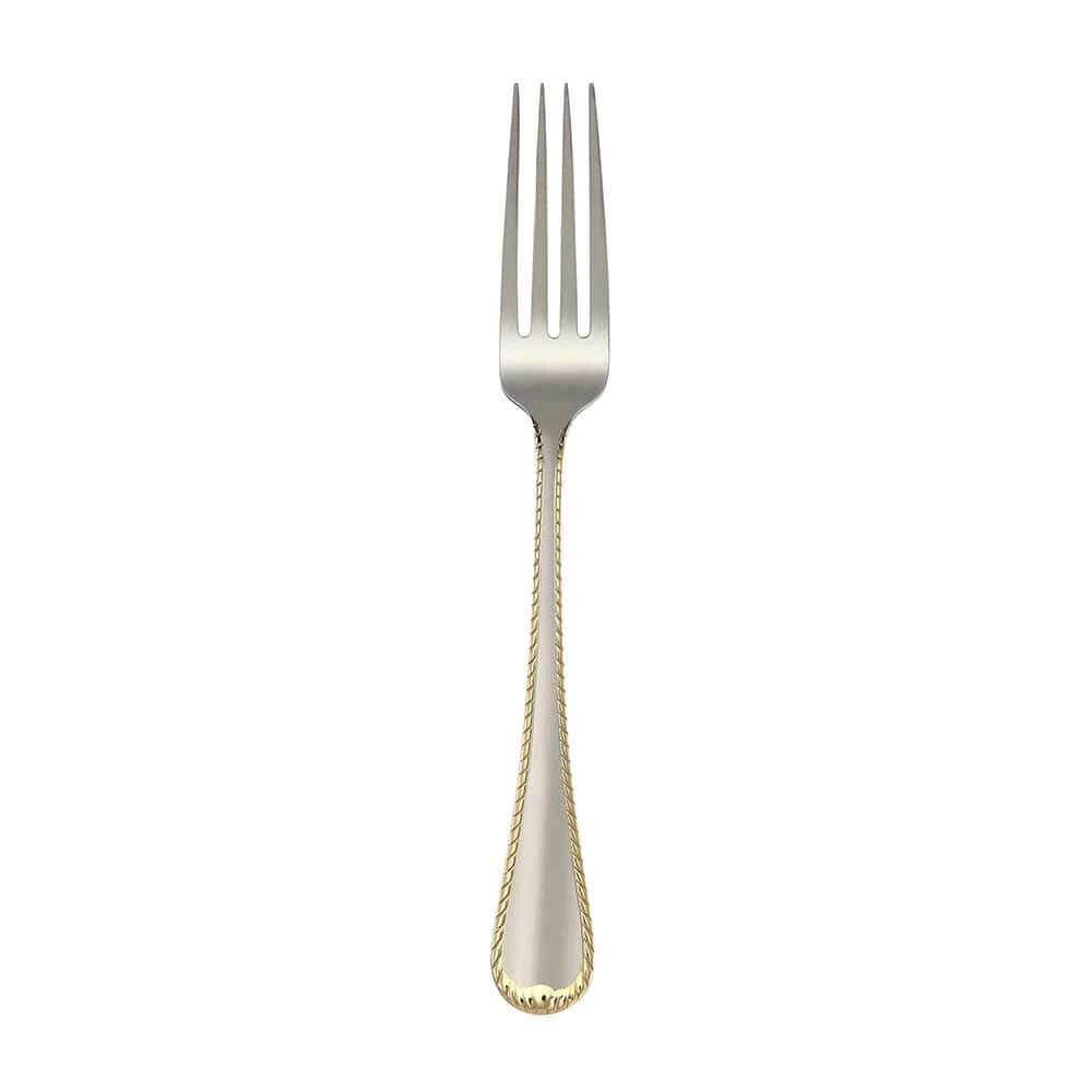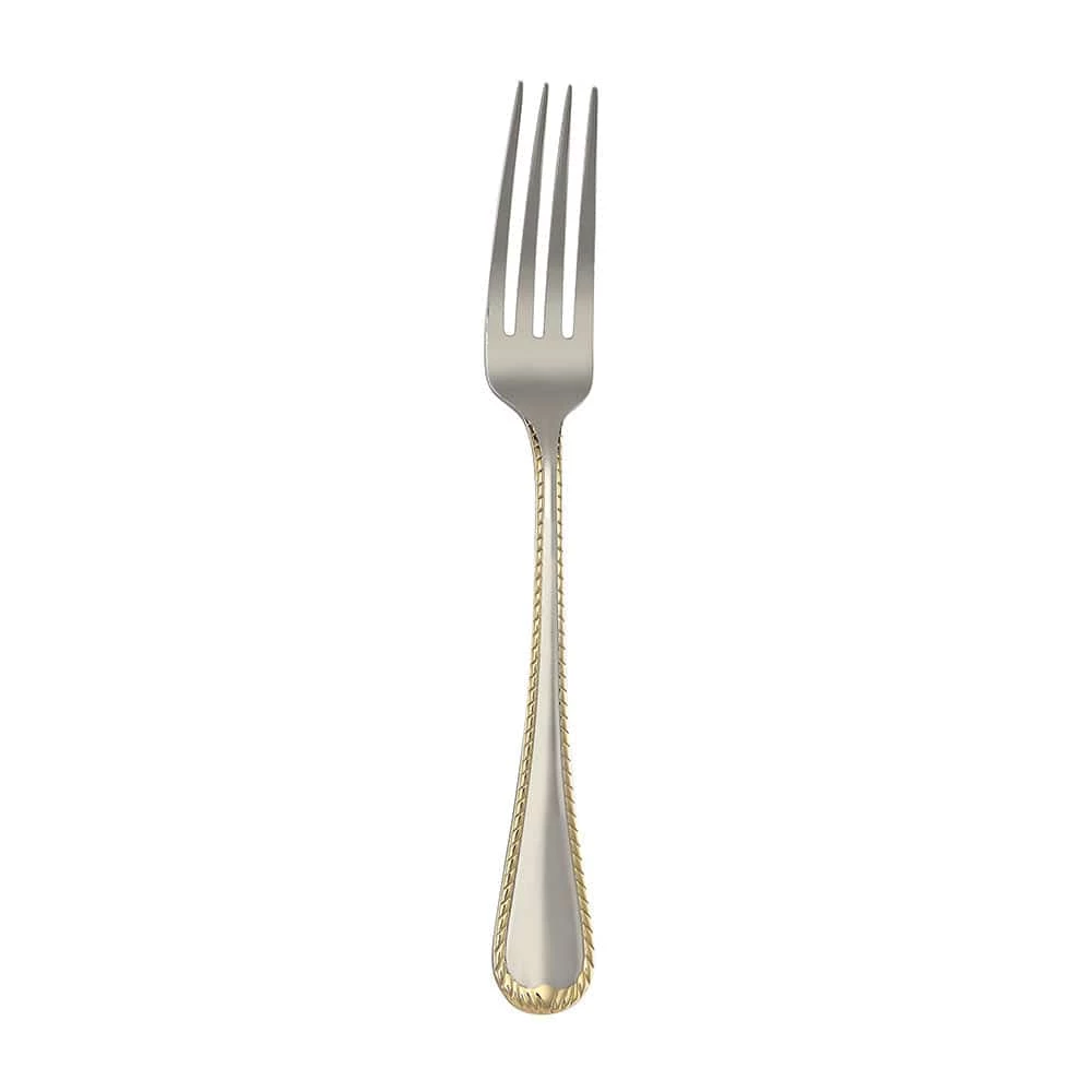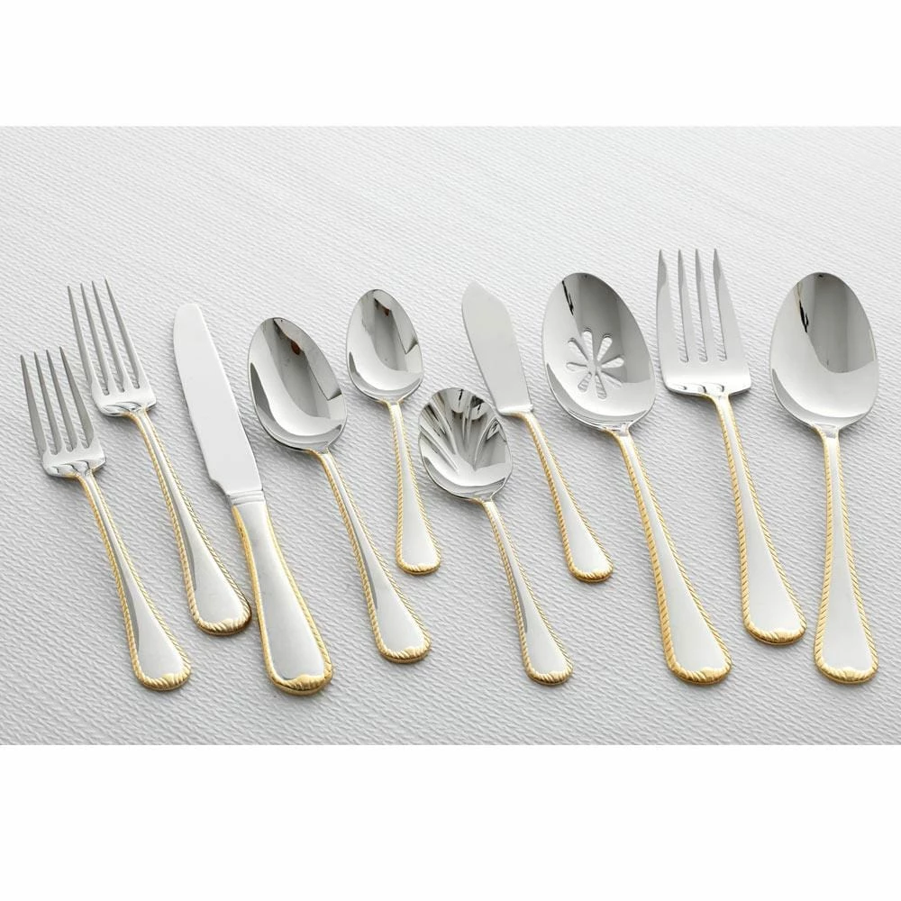 Cameo Gold Flatware, by Mikasa, is a beautifully finished silverware adorned with gold accents making for an unforgettably elegant table. This set is perfect for formal dinners, teas, and luncheons. The wide, tapering handles and flowing lines add graceful touches to any table. Crafted of superior quality 18/10 stainless steel accented with 24 karat gold. 65 piece set, service for twelve, includes (12) each: dinner fork, salad fork, dinner knife, dinner spoon and teaspoon, plus (1) each: tablespoon, pierced tablespoon, cold meat fork, butter knife and sugar spoon. Hand washing recommended.