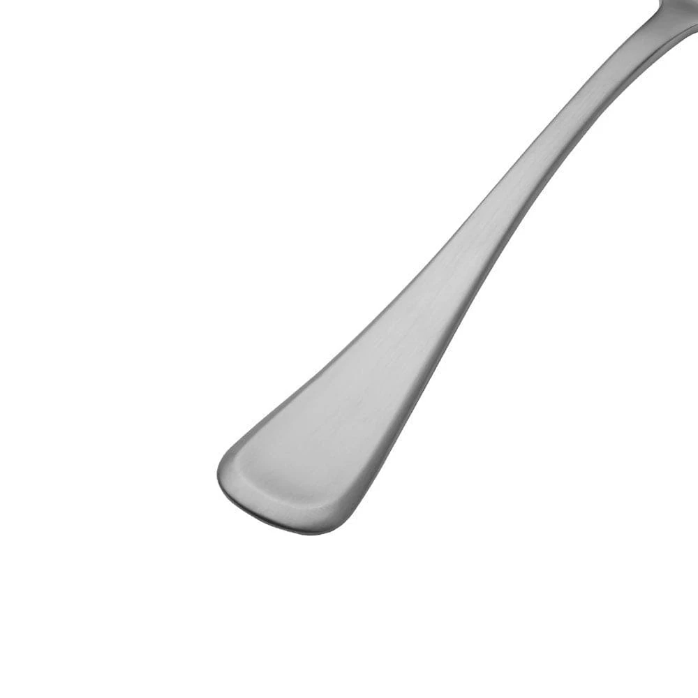 This Cosmo Satin Cold Meat Fork features a basic teardrop shaped handle that is unexpectedly thick, with curved edges at the tip, and a lustrous mirror finish, giving it a modern, industrial look and feel.
