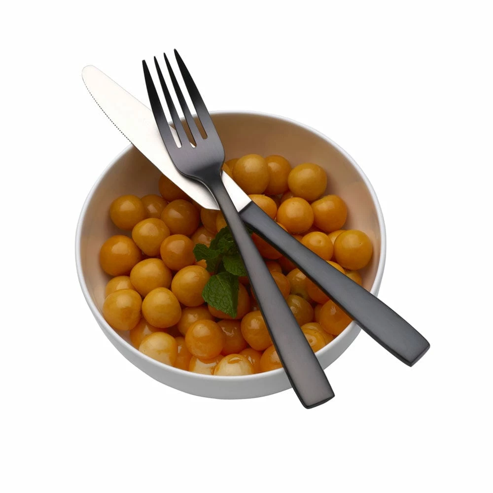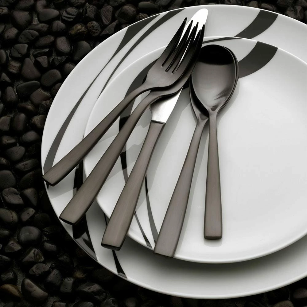 This Mikasa Delano Gunmetal Flatware Set features a deep, rich finish that is versatile enough to complement any table setting. Crafted of 18/0 stainless steel, this set will stand up to the rigors of everyday use. 20 piece flatware set, service for four, includes (4) each: dinner fork, salad fork, dinner knife, dinner spoon and teaspoon. Hand wash.
