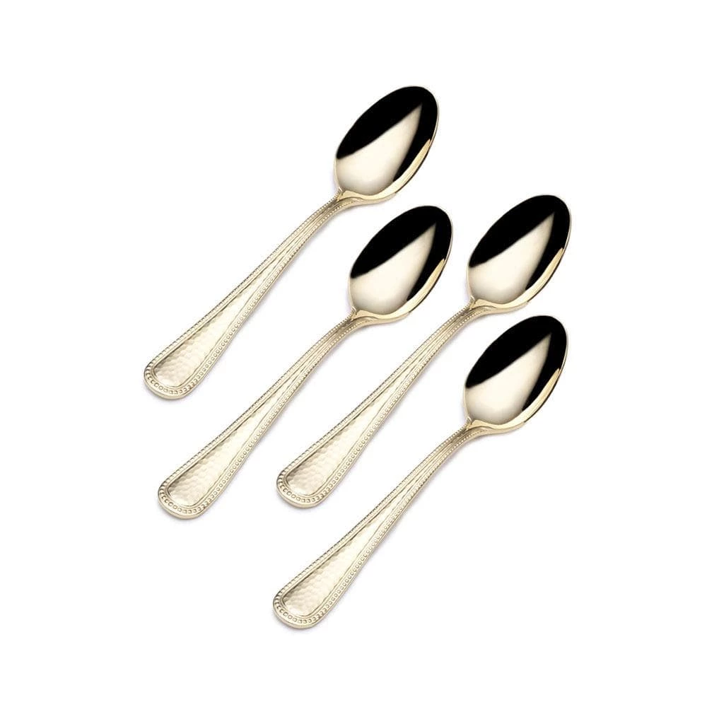 This Halston Gold Plated Flatware features a classic hammered and beaded texture design, giving the sleek handles a faceted shimmer. This gold plated premium 18/0 stainless steel set will stand up to the rigors of everyday use. Set of 4 Mini Coffee Spoons, each measures 7-1/2 inch long. Dishwasher safe.