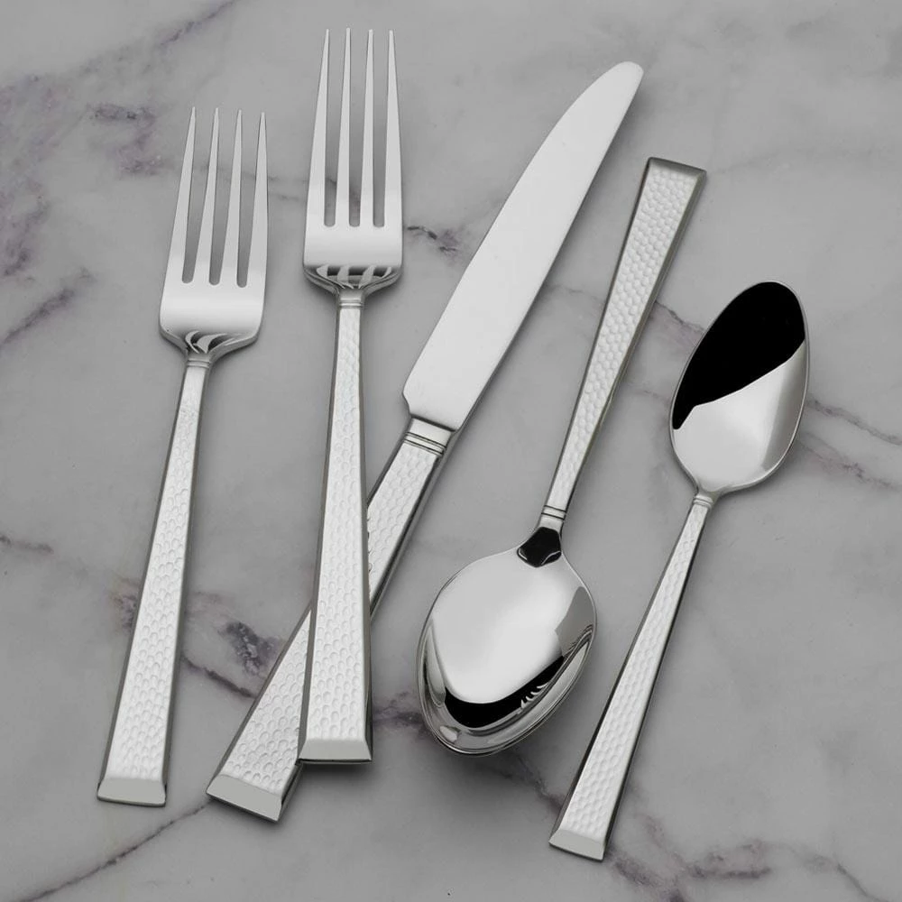 Mikasa Kyler Flatware brings contemporary elegance to the table. Each piece is crafted from premium 18/10 stainless steel to deliver outstanding beauty and performance. A modern hammered texture gives the sleek handles a faceted shimmer that will make a bold statement at every dining occasion. Flatware wears a lustrous mirror finish yet goes safely through the dishwasher without needing polishing. 20 piece set, service for four, includes (4) each: dinner fork, salad fork, dinner knife, dinner spoon, and teaspoon. Dishwasher safe.