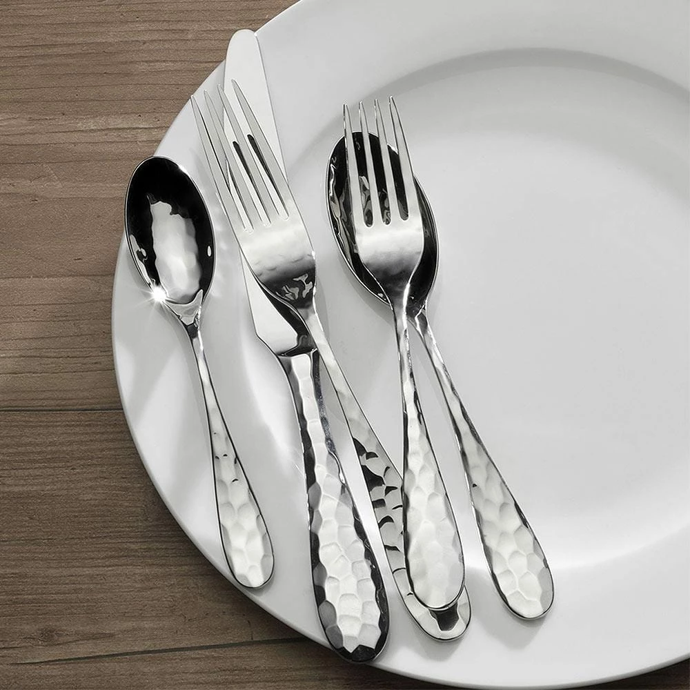 This Mikasa Lilah Flatware features a classic design and casual hammered tone making it perfect for an elegant dinner or casual brunch. Quality crafted of 18/10 stainless steel. 20 piece set, service for four, includes (4) each: dinner fork, salad fork, dinner knife, dinner spoon and teaspoon. Dishwasher safe.