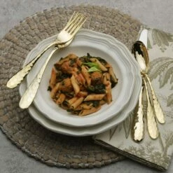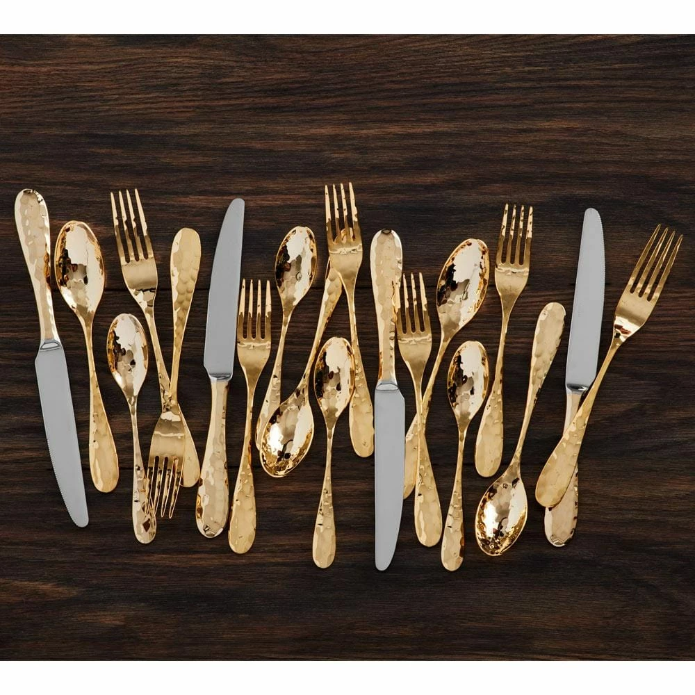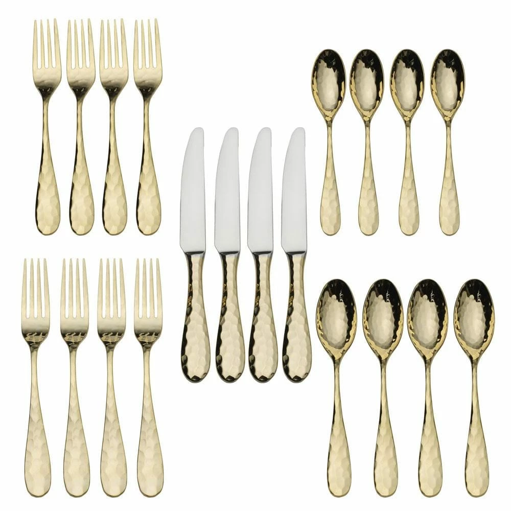 This Mikasa Lilah Gold Plated Flatware features a gold plated, classic design and casual hammered tone making it perfect for an elegant dinner or casual brunch. Quality crafted of gold-plated, 18/10 stainless steel. 20 piece set, service for four, includes (4) each: dinner fork, salad fork, dinner knife, dinner spoon and teaspoon. Hand wash.