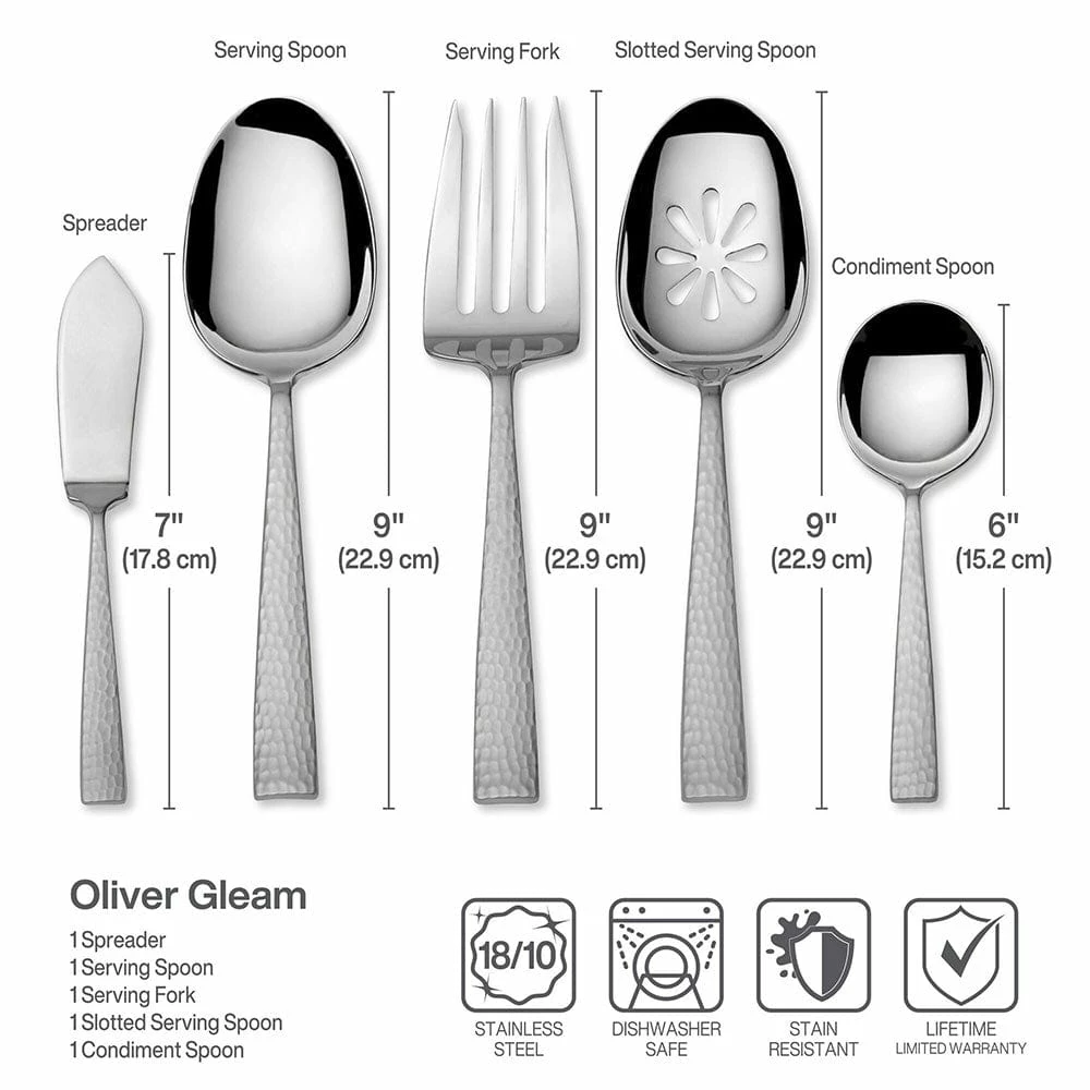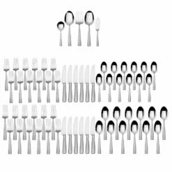 This Mikasa Oliver Mirror 65 Piece Flatware Set features a classic design and casual tone, making it perfect for an elegant dinner or casual brunch. Quality crafted of 18/10 stainless steel. 65 piece set, service for twelve, includes (12) each: dinner fork, salad fork, dinner knife, dinner spoon, and teaspoon, plus (1) each: serving spoon, pierced serving spoon, cold meat fork, sugar spoon and butter knife. Dishwasher safe.