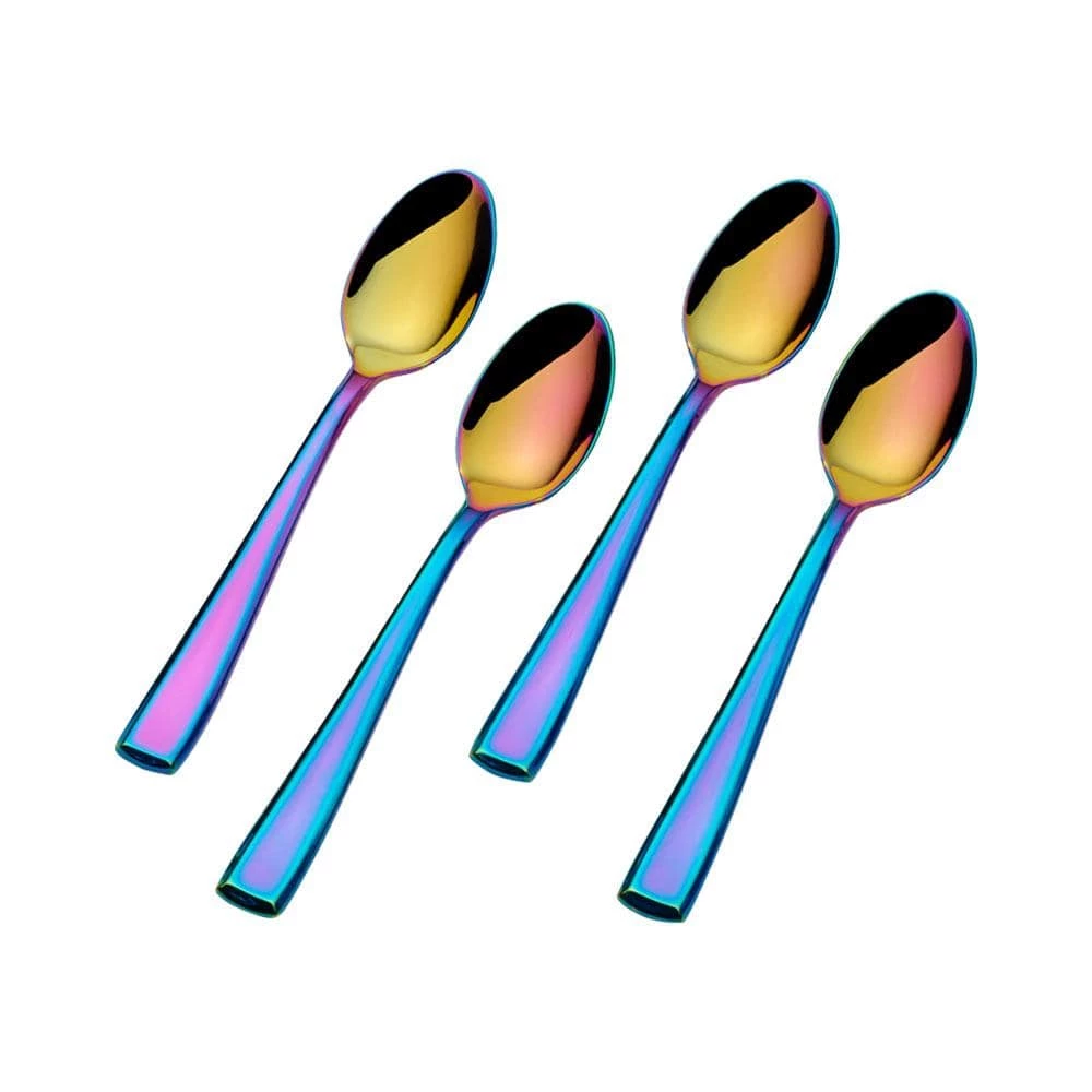 This Towle Living Rainbow Dream Set of 4 Mini Coffee Spoons will add a colorful accent to your table setting. Ideal for use with coffee and tea, and other after-dinner refreshments. Crafted of high quality 18/0 stainless steel. Dishwasher safe. Set of 4 mini coffee spoons, each measures 5-1/2 inch long.