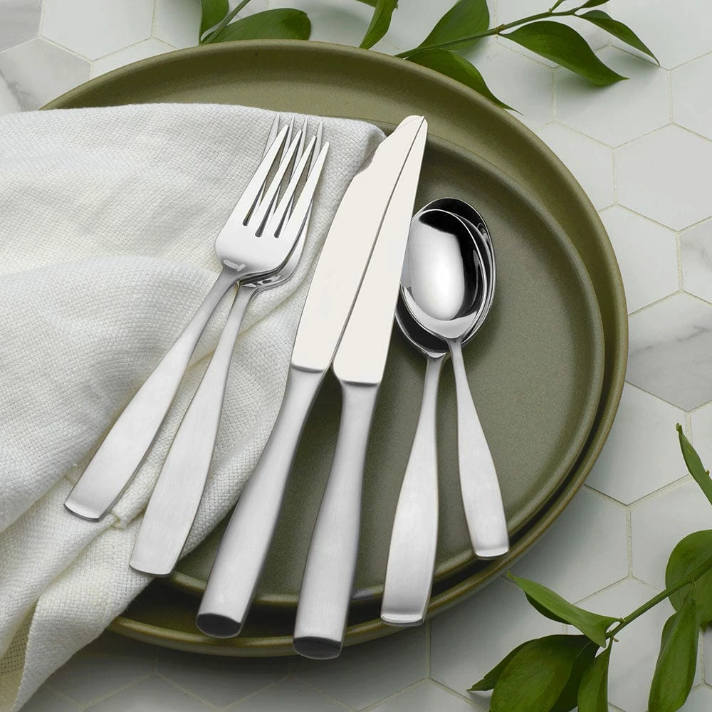 This Satin Loft Flatware Set features an understated design, with trendy, unexpected square cut angled tips, and a smooth satin finish and gentle curves that will add a touch of sophistication to your dinner gatherings and complement any table.