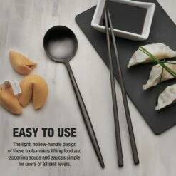 This Studio Nova Black Chopsticks and Spoon Set features light, hollow-handles making lifting foods and spooning soups and sauces simple for users of all skill levels.