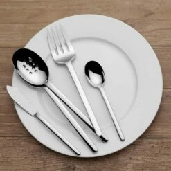 This Mikasa Zena Flatware Set features a classic, simple design that will complement virtually any table setting. Crafted of 18/0 stainless steel. 45 piece flatware set, service for eight, includes (8) each: dinner fork, salad fork, dinner knife, dinner spoon and teaspoon, plus (1) each: tablespoon, pierced tablespoon, cold meat fork, sugar spoon and butter knife. Dishwasher safe.